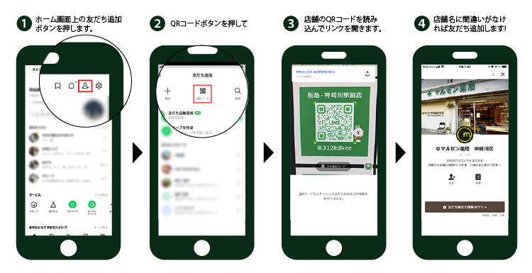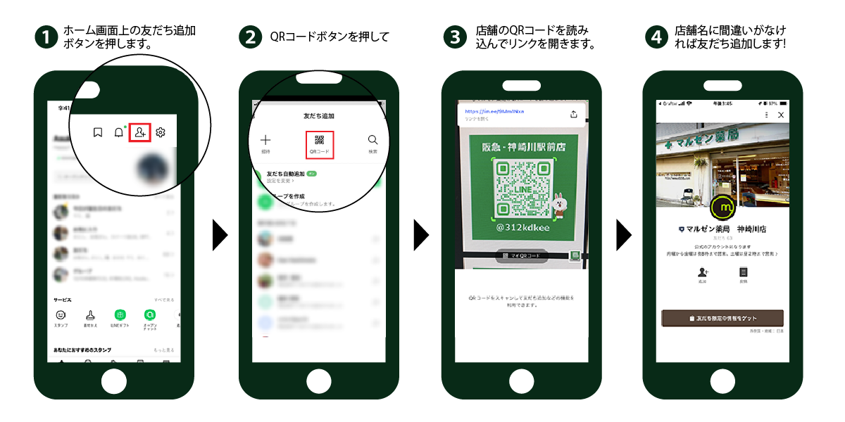 スマホのLINEアプリの「ホーム」画面上部にある、「友だち追加」ボタンを押し、「QRコード」ボタンを押すと、QRコードリーダーが現れるので、ご利用されているマルゼン薬局のQRコードを読み込むと、「リンクを開く」ボタンが表示されるので、リンクを開いて、「友だち追加」をしてください。( 注 : 各店舗のQRコードは全て異なりますのでご注意ください。)