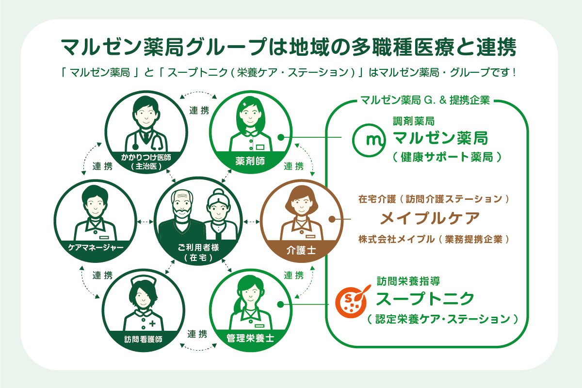 マルゼン薬局グループは、大阪市内で調剤薬局を展開する「マルゼン薬局」を中心に、 認定栄養ケア・ステーション「スープトニク」、人材派遣の「エンデヴァー」を経営、運営するグループ企業です。 また、在宅介護の「株式会社メイプル」との業務提携によって、処方せんの調剤だけではなく、地域医療や介護をサポートする一員として、地域の人々の健康を維持し、毎日の幸せな生活をお約束しています。