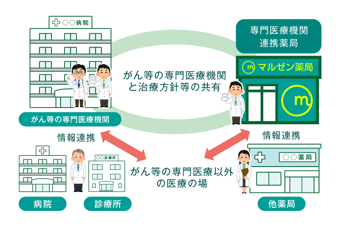 がん治療の専門医療機関と治療方針などを共有し、専門性の高い薬学的管理を行うことで、抗がん剤などのお薬を使用している患者さんを支えていく薬局です。マルゼン薬局では、がんに関する専門的な知識を持った薬剤師が対応します。 プライバシーに配慮された空間で相談することができます。 バリアフリー対応。車いすの方も安心して来局していただけます。 がん専門医療機関と連携して、必要な情報は地域の医療機関や薬局に情報提供します。